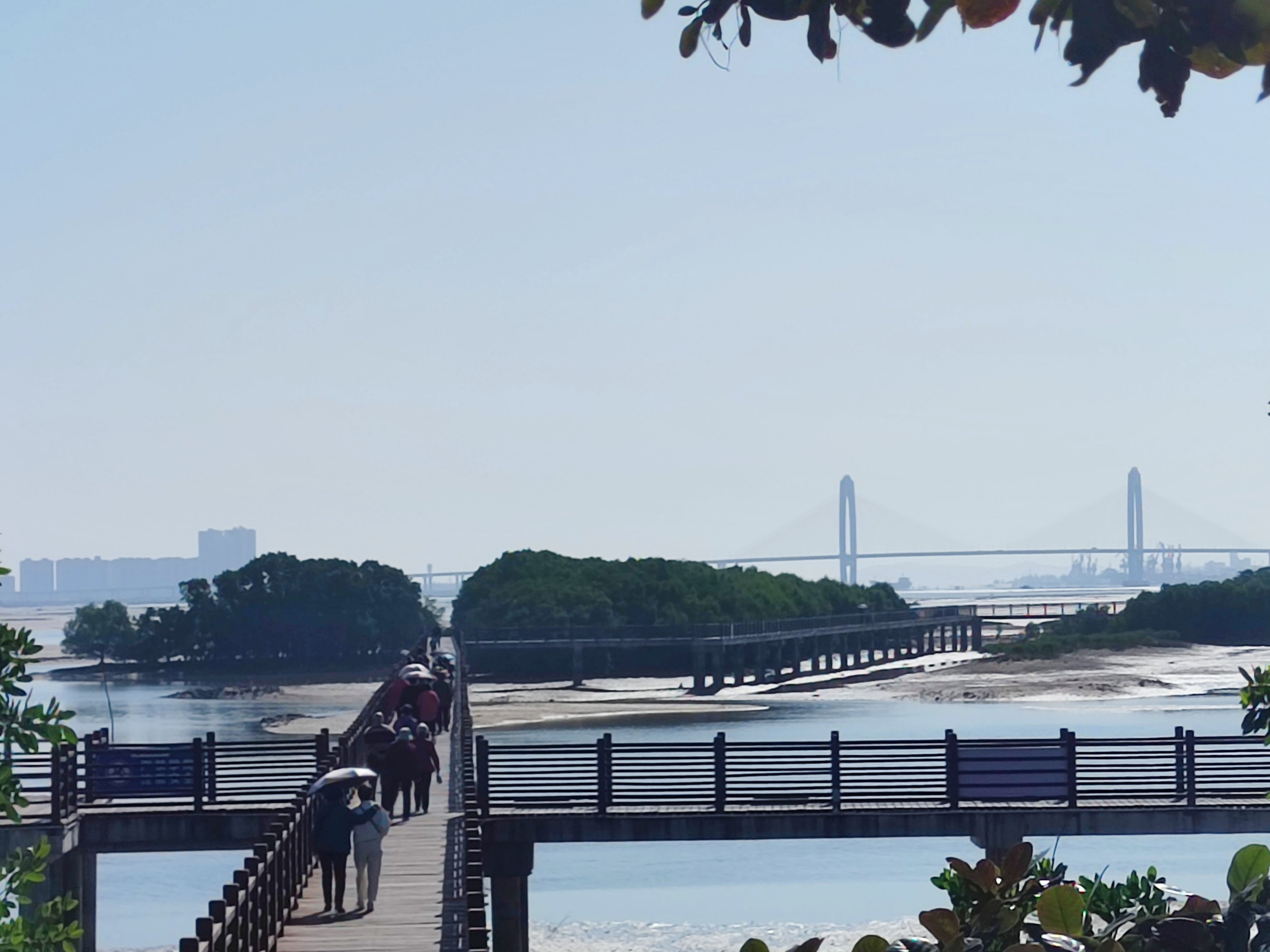 或许在这个位置下来,再走过海堤路的人行班马线,上到步行绿道,向着栈道方向漫步前进… 在印象中,好些游巴亲爱的游客游人们都是在那个观鹭阁处上落的多,还有就是从观鹭阁处下,步行到中间的亲水平台处上来的较多,或者从亲水平台处向观鹭阁方向步行的多,而走向一中那边的这个栈道出口或从返个栈道囗不的较少点…