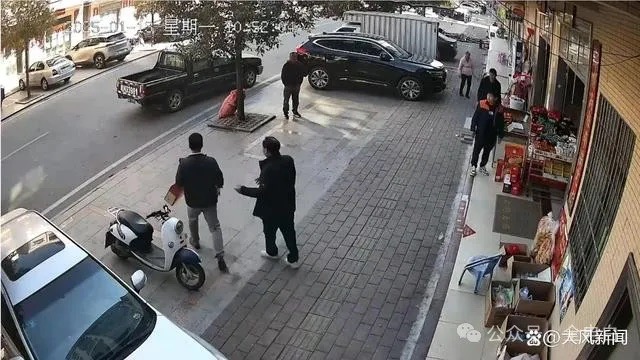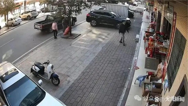 监控视频显示,事发时间为1月13日上午10时51分,一辆“粤K939**”的黑色皮卡车停靠在路旁,车上走下两名黑衣男子,一人径直走到商铺前,将店门口摆放的盒子拎起就走。离开监控区域后,多名店家走出店铺查看。