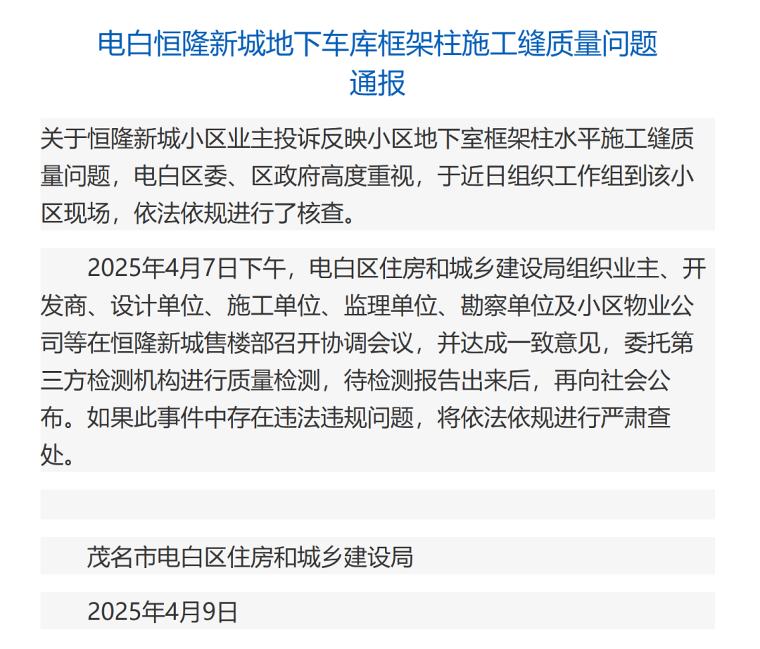 恒隆新城开发商及施工单位方认同政府部门主导的质检程序,不认可个别“业主”无理取闹做法。目前已收集并固定了近期虚假恶意炒作、破坏建筑结构、危害公共安全相关证据,将通过法律途径维护企业及全体业主的合法权益。
