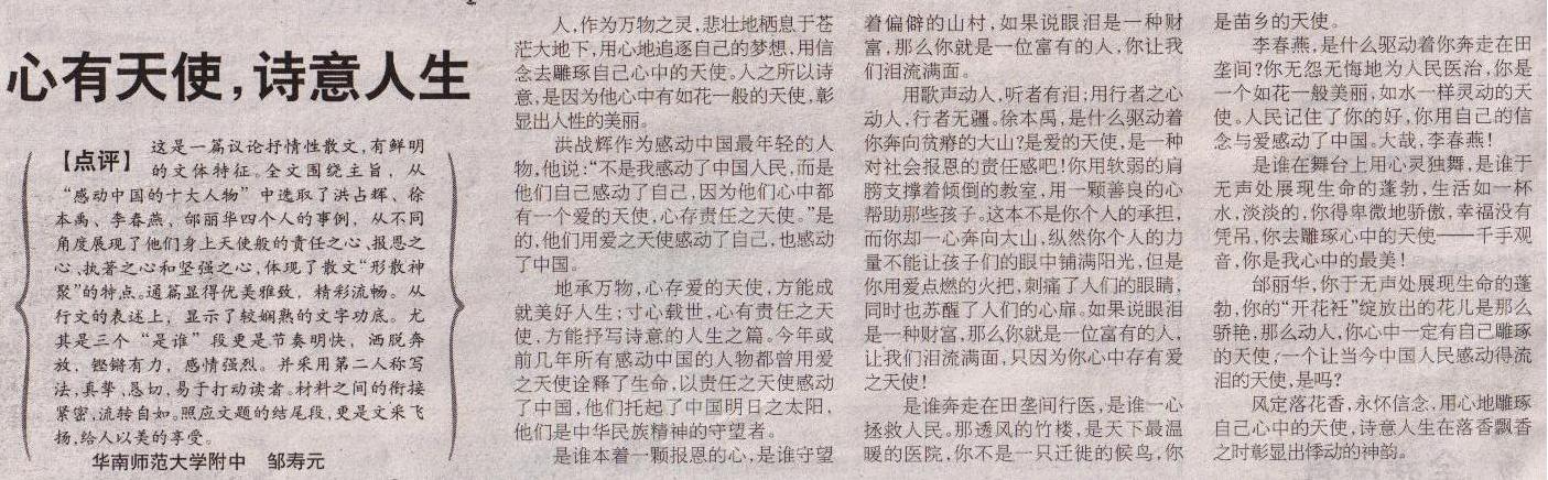 蒋述卓(暨南大学党委书记、副校长、著名文艺学家):“天使”本身是一种比拟,每个人心中都有自己的“天使”,每个考生可以自由选择自己心中认为美好圣洁的象征作为题材。比如从“白衣天使”、“洪战辉”等生活中的英雄,到“超女”、“哈利・波特”等娱乐、小说人物,甚至在日常生活中遇到的平凡人,但因与自己的某种感受、经历相连,而成为心中的“天使”。因此,对考生来说,不易跑题。
