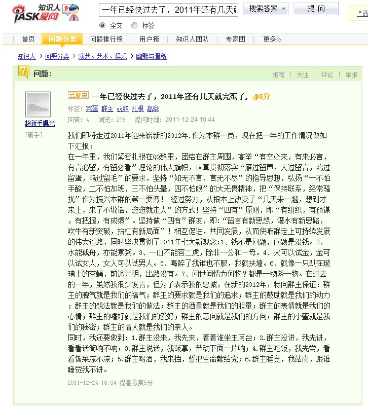 一年已经快过去了,2011年还有几天就完蛋了,我们即将走过2011年迎来崭新的2012年里,团结在坛主周围,高举“有空必来,有来必言,有言必留,有留必看”理论的伟大旗帜,认真贯彻落实“雁过留声,人过留言,鸡过留蛋,鸭过留毛”的要求,坚持“知无不言、言无不尽”的指导思想,弘扬“一不怕手酸,二不怕加班,三不怕头晕,四不怕眼花”的大无畏精神,把“保持联系,经常骚扰”作为振兴本坛的第一要务! 经过努力,从根本上改变了“几天来一趟,想到才来上,来了不说话,逛逛就走人”的方式!坚持“四有”原则,即“有组织,有预谋,有把握,有成绩”。坚持做“四有”坛友,即:“留言有新思想,灌水有新思路,吹牛有新突破,抬杠有新局面”!相互促进,共同发展,从而使咱坛走上可持续发展的伟大道路,同时坚决贯彻了2011年七大新观念:1、钱不是问题,问题是没钱。2、水能载舟,亦能煮粥。3、一山不能容二虎,除非一公和一母。4、火可以试金,金可以试女人,女人可以试男人。5、喝醉了我谁也不服,我就扶墙。6、就像一只趴在玻璃上的苍蝇,前途光明,出路没有。7、问世间情为何物?都是一物降一物。