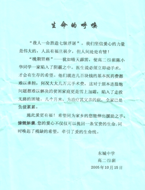 日前,电白东城中学高二(5)班的四、五十名学生自发走上水东街头,在车站附近、西湖公园门口等5个地方设点接受募捐,至晚上10时即募得捐款3142.3元。随后,他们将募捐所得,送到同班同学陈小华的家中,给其父亲作治病之用。