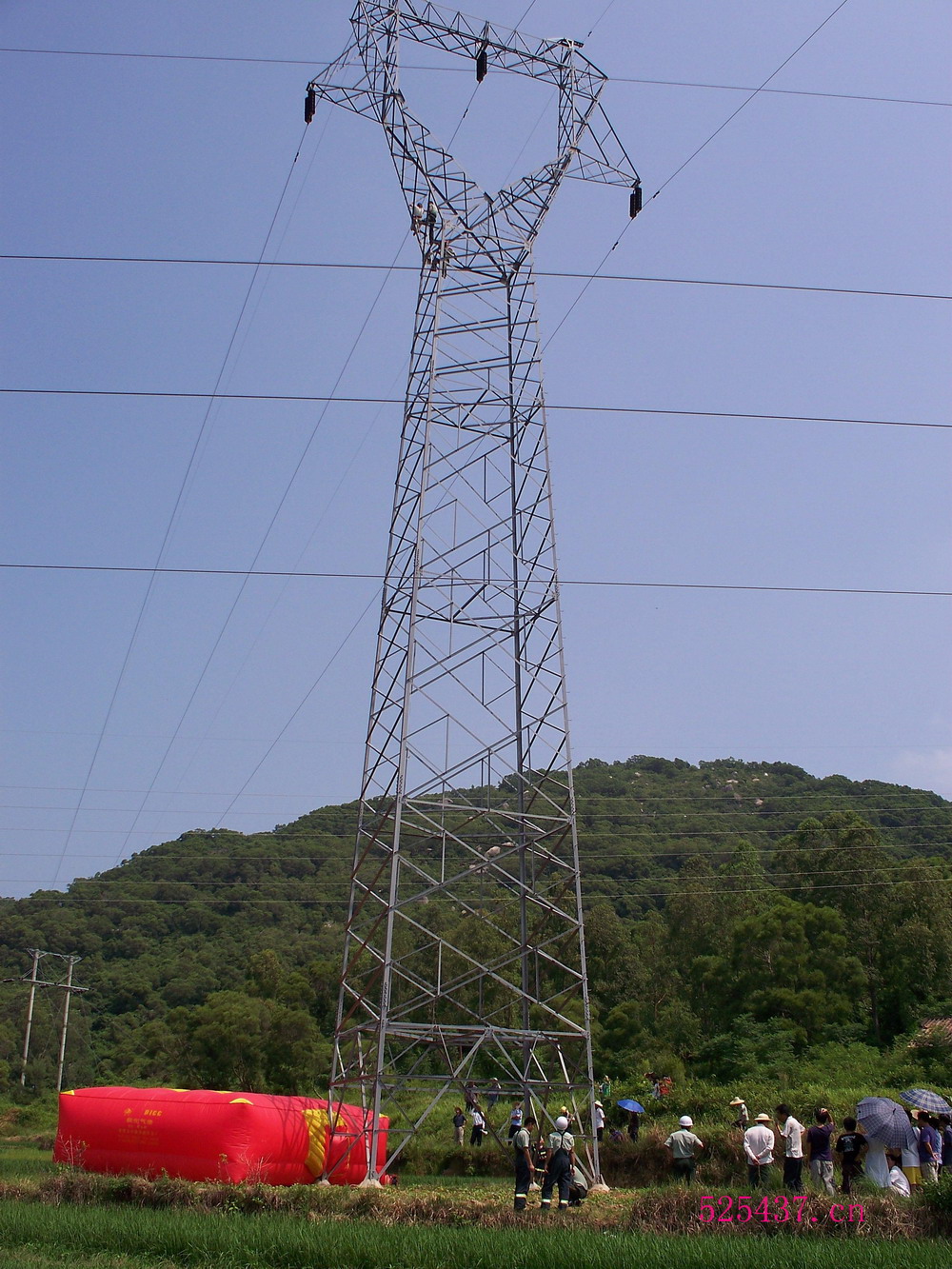 消防车到了,气垫打开,两名消防员也爬了上去,塔下众多围观群众…不知是精神病还是自杀…估计讨薪不会跑到这么偏僻的地方…