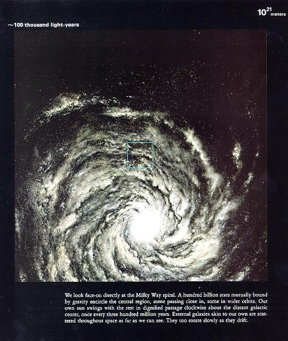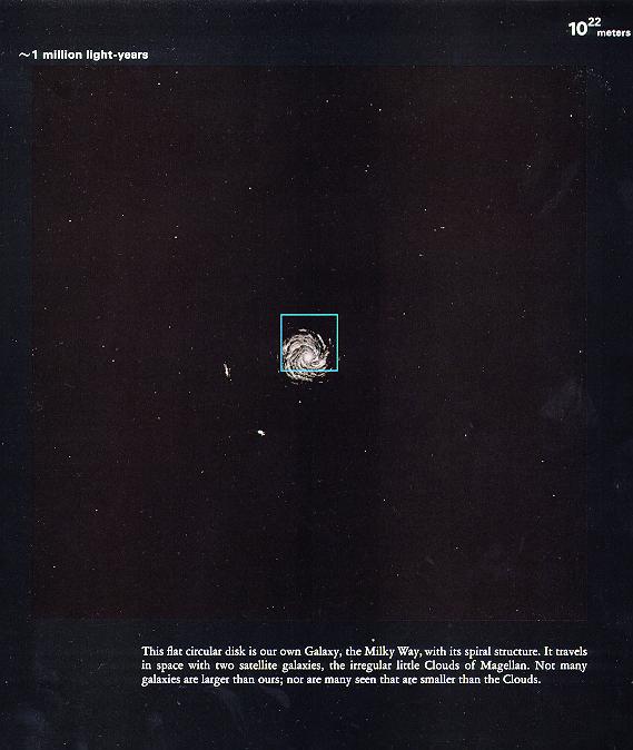 在10万光年这样的数量级下,我们就看见了整个的银河系。事实上,银河系的直径就是十万光年。真有哪位能发明个跟光速一边快的飞船,从银河系的这边飞到对面来个大吊角,就要十万年的时间!我靠,在这样漫长的旅程来看,人生不过朝生暮死,蜉蝣一般。但这只是对相对于银河系静止的观测者而言,船上的人员感受到的旅程其实只有数分钟。相对论呀,深了去了。