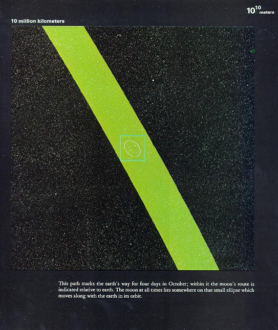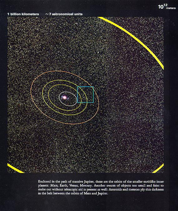 放大十倍来观察以繁星为背景的太阳系。说是繁星,其实与太阳最近的恒星――半人马座比邻星都是在4.22光年开外的。图中的亮点仅仅只是背景上离得八丈远的星星呢,并不是太阳系的一部分。