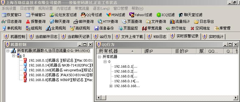 《百络网警》可控制BT下载、对互联网进行流量控制和带宽管理;可对SKYPE进行监控,可监控MSN、ICQ、YAHOO通、QQ聊天室的聊天记录以及QQ聊天行为;可完整监控通过WEB、OUTLOOK或FOXMAIL收发邮件的内容和附件记录;可记录和控制所有用户在各论坛发言;可控制用户通过HTTP、FTP或即时通讯等上传和下载文件;防止企业的商业秘密和资料文件通过互联网外泄;可对聊天、邮件、网址等进行关键词过滤;产品内核使用上海百络信息技术有限公司自主研发的具有世界领先水平的Kercap内核驱动引擎,保证了在特大流量和特大用户的网络环境下该产品稳定可靠的性能,其强大实用的功能、全球领先的技术和优秀的品质使产品在业内遥遥领先,是最优秀全面的互联网管理和上网监控软件。