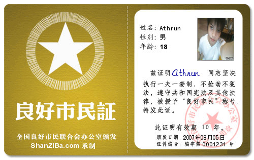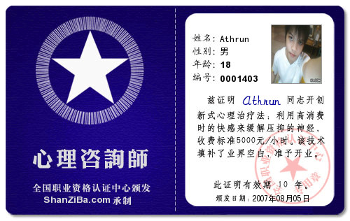 心 心语∽宝宝 哈佛大学(撕咯丝教授) 注册 2005-02-05 消息 2,321 反馈评分 0 点数 61 年龄 36 2007-08-06 #585 这是我的证件 附件 心理咨询证.jpg 58.3 KB · 查看: 616 良好市民证.jpg 60.5 KB · 查看: 618