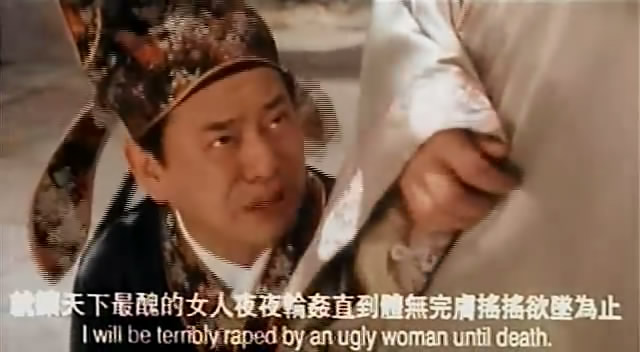 祝枝山:哎呀,伯虎啊,你唔好罹好唔好啊?最多我发毒誓,如果我再赌钱话,我就畀天下最丑样女人日日轮奸至体无完肤,摇摇欲坠为止,n得未吖?