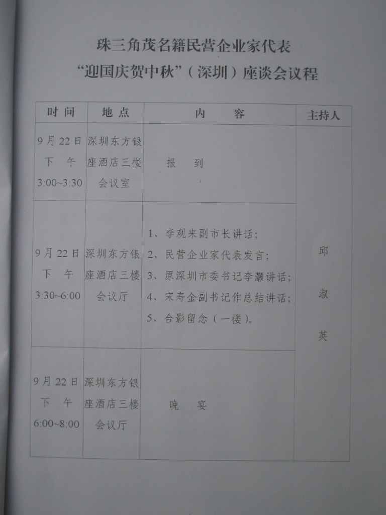 由茂名统战部主办的珠三角茂名籍民营企业家“庆国庆迎中秋”(深圳)座谈会将于本月22日在深圳东方银座酒店三楼“纽约厅”举行,市委副书记宋寿金、副市长李观来、统战部部长邱淑英、市府副秘书长叶文届时将出席座谈会,并特邀深圳市原市委书记李灏、原茂名市市长黄春藻、原深圳市人大副主任莫华枢、梁俊华、龙岗区人大主任廖寿伦出席,以及茂名市政府驻深办领导、深圳市茂名科技经济促进会副会长以上人员及珠三角深圳外其他地区的茂名籍民营企业家将应邀出席会议。