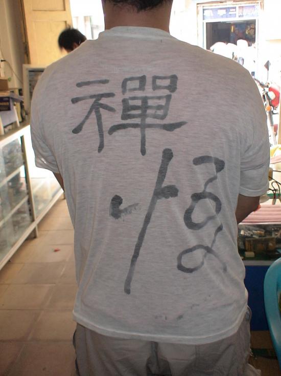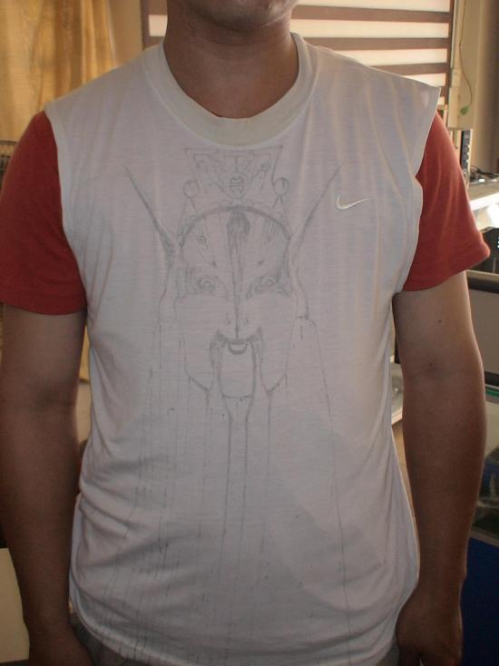 第三件作品我很满意.临摹的达摩像因为水平问题和原作有出入.原作端庄肃穆,临摹出来的却微微带笑,但错有错着,颇有些掂花一笑的味道."佛"字一气呵成,(其实是两笔,因为用毛笔沾铁油在衣服上写字,难度很大),是我印象中最满意的字.但写完陶醉后,却不禁叹息."佛"字没点祥和的味道,却在隐隐中透出戾气,字如其人,难救了.