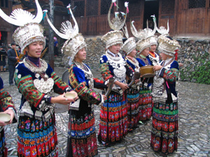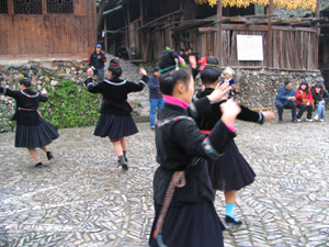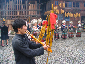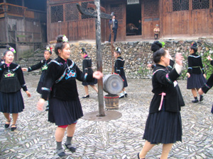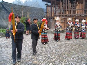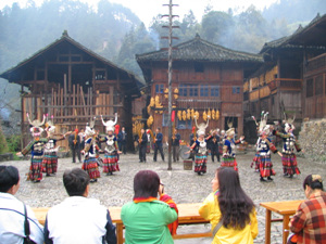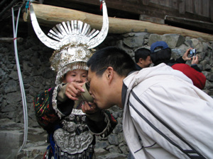 苗寨的拦路酒,一共有12道,是玉米高粱酒,不能用手去接,否则,一牛角酒你必须喝完。