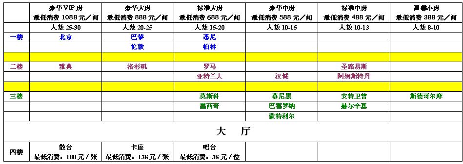 小房最低消费是388元.大厅吧台最低消费为38元/位,三台100元/张,卡座138元/张