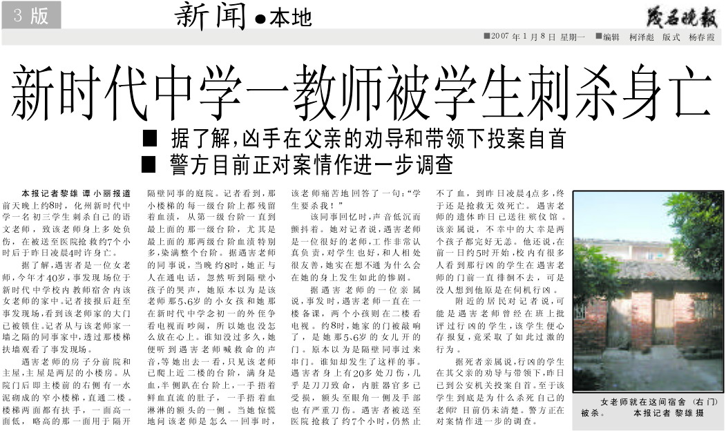 遇害老师的房子分前院和主屋,主屋是两层简陋的小楼房。主楼前的右侧有一水泥砌成的窄小楼梯,直通二楼。记者在案发地点看到,楼梯染满血渍。据遇害老师的同事说,当晚约8时,她正与人在通电话,忽然听到隔壁小孩子的哭声,她原本以为是该老师那五六岁的小女孩和她那在新时代中学念初一的外侄看电视而吵闹,所以她也没怎么放在心上。谁知没过多久,她便听到遇害老师喊救命的声音,等她出去一看,只见该老师已爬上近二楼的台阶,满身是血,半侧趴在台阶上,一手捂着鲜血直流的肚子,一手捂着血淋淋的额头的一侧。当她惊慌地问该老师是怎么一回事时,该老师痛苦地回答了一句:“学生要杀我!”该同事回忆时,声音低沉而颤抖着。她对记者说,遇害老师是一位很好的老师,工作非常认真负责,对学生也好,和人相处很友善,她实在想不通为什么会在她的身上发生如此的惨剧。