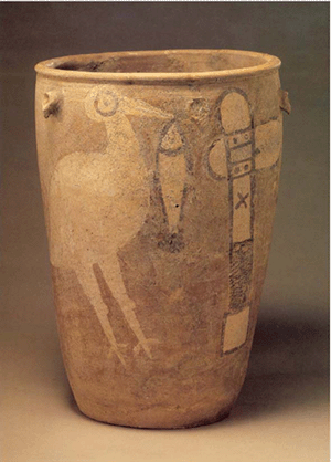 新石器时代。陶质彩绘,器高47cm、口径32.7cm。1978年河南省临汝县阎村出土,属新石器时代仰韶文化类型,陶缸绘有鹳鸟衔鱼,旁边竖立一件石斧的画面,作者用白色在夹砂红陶的缸外壁绘出鹳、鱼、石斧,以粗重结实的黑线勾出鹳的眼睛、鱼身和石斧的结构,画面效果粗犷有力,绘画具有中华民族远古时代的造型特征,是一件罕见的绘画珍品。现藏于:中国历史博物馆。