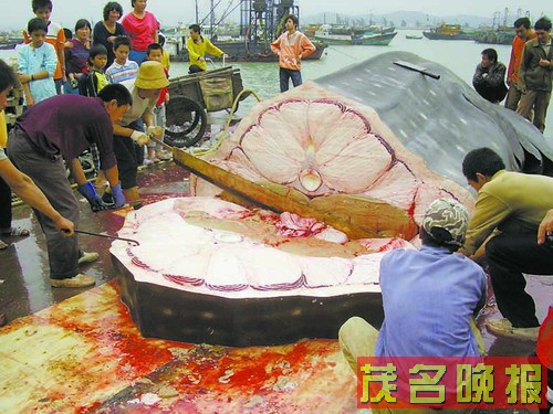 [attachmentid=126317]奇哉!捕获10米巨鲨引来群昨天(3月15日)上午,一条长近10米,重约8吨的巨鲨被捕获后运载回博贺渔码头肢解,引来许多群众围观。记者中午12时赶到现场,巨鲨已肢解了一半。