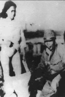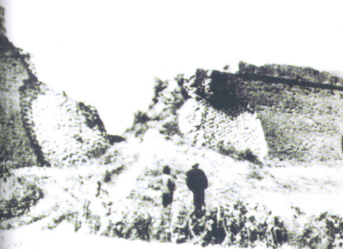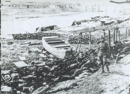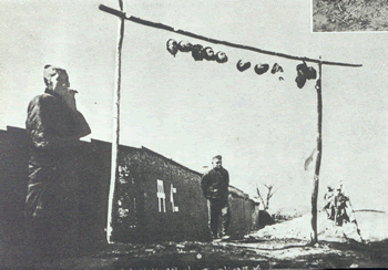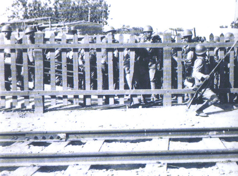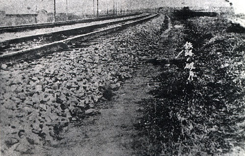 日军在“铁路爆炸事件”假证据前:图为日军在破碎的枕木、军帽、枪支等假证据前留影。
