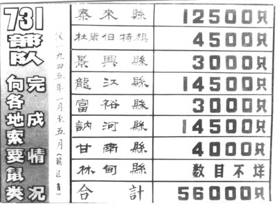 同年,日本成立“关东军防疫供水部”(即731细菌部队),后来扩大成一支大规模的细菌战部队。该部队用中国人进行鼠疫、霍乱、梅毒等细菌以及毒气、枪弹等的活体试验,并大量制造鼠疲、霍乱等各种细菌,用飞机撒播在中国各地,残害中国人民。