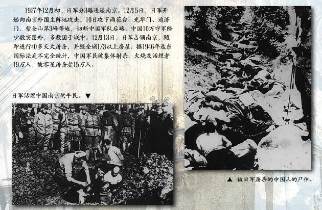 11月,日军占领上海,在南市放火连烧9日,军民死伤无数,上海5255家中国工厂被占,损失超过8亿元。12月13日,日军攻下当时中国的首都南京,进行惨绝人寰的大屠杀,在6周内烧杀淫掠,杀死30多万手无寸铁的中国人,烧毁南京三分之一的房屋。