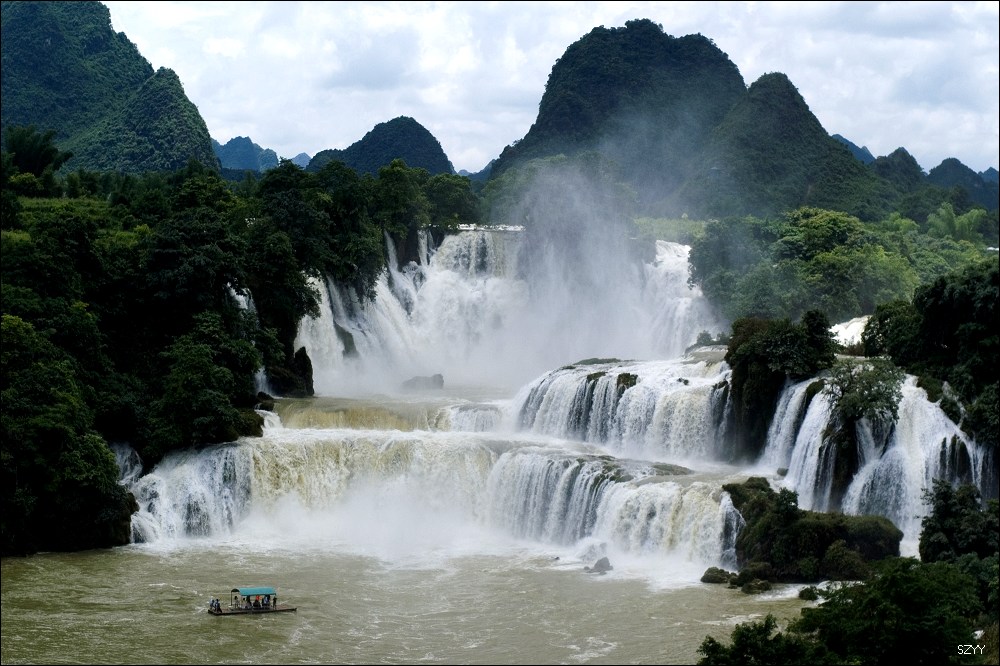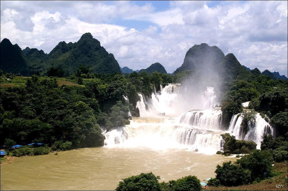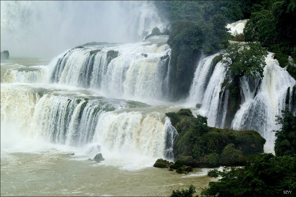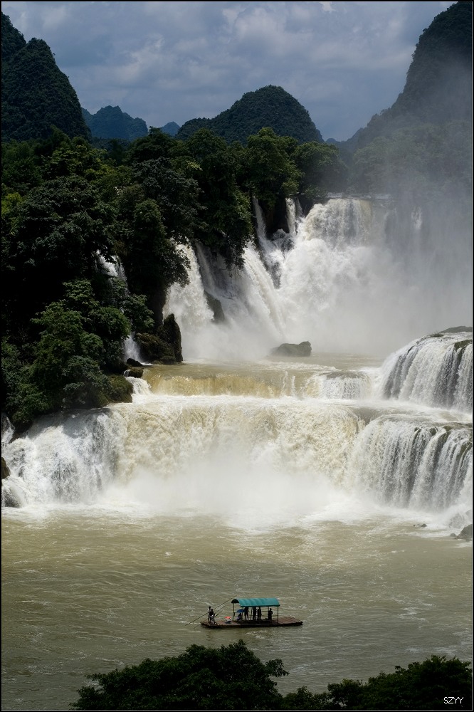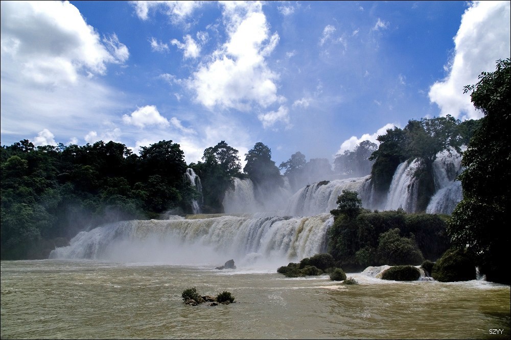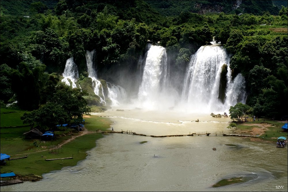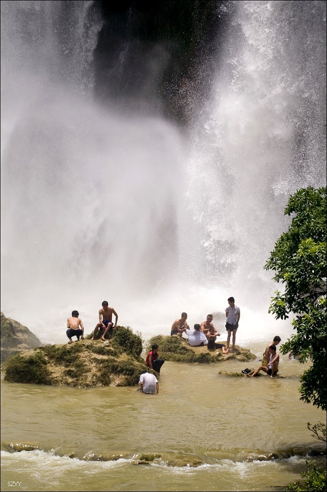 左侧小瀑布属于越南,右侧大瀑布属于中国,以河为界,越南方面计划在河的上游修建水坝,以后要看到漂亮的瀑布就要碰时间了.