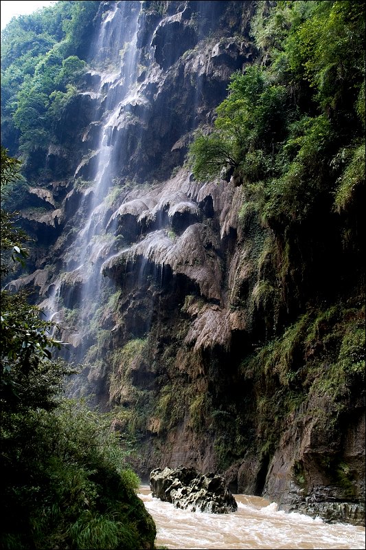 拍摄之后,沿着观光道,下到瀑布附近,在这个角度再看瀑布就没什么感觉了,看来要看德天只能俯瞰。不过在瀑布下面非常凉快,水雾漫天,只能把相机收到摄影包里。休息一会儿,往回走,河谷非常闷热,背着摄影包感觉很重,走了一段路,开始爬台阶,跟着老郎、老严和哒咏一起走,渐渐有些体力不支,跟哒咏说,我有点累,你们先走,于是坐在台阶上喘粗气,他们等了一会儿不见我上去,哒咏过来看情况,跟我说还剩20个台阶,并且下来帮我把摄影包拎了上去,我又喘了一会儿粗气,继续向上,终于上到公路边。