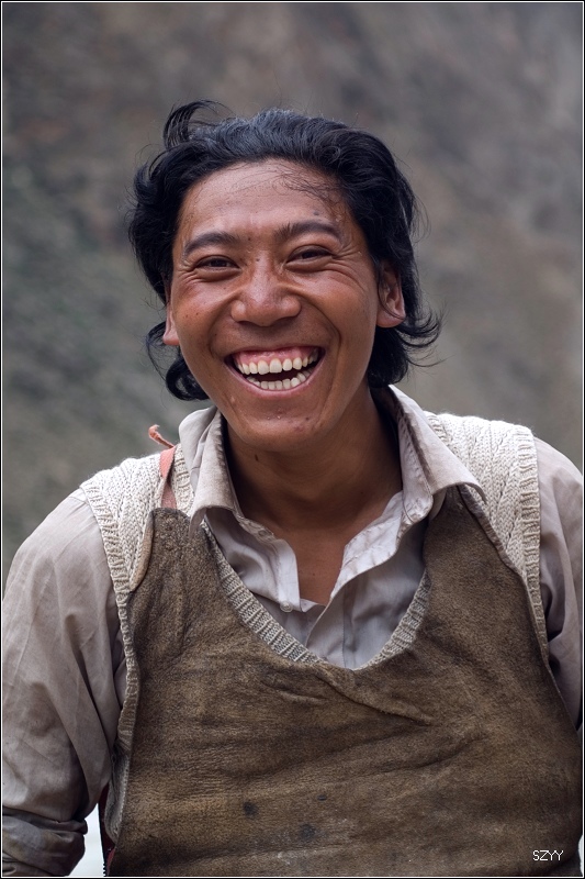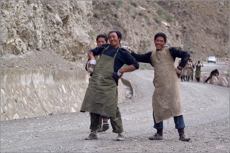 7点从左贡出发,8点45到达海拔4400米的邦达兵站。一路上坡,9点15翻越4618米的业拉山口,下坡,对面就是著名的99道拐,大雾弥漫,只能偶然看到对面的路,想拍摄99道拐是不可能了,一路下坡,我不停地做着重复动作,就是向左打方向盘、向右打方向盘,向左、向右、向左、向右……不断重复,快下到坡底的时候,看到十个左右磕长头的藏民,其中三个是女的。我们友好地跟他们打招呼,举起相机示意他们要拍照,他们非常愉快地接受了,我们拍了些照片,把车开到前面等着他们,然后继续拍照,他们从容地磕着长头,接近我们的时候,有几个调皮的青年摆着各种POSE,做着怪动作,让我们拍照,然后还跟我们合影,我们让他们看相机LCD上的照片,他们非常开心。