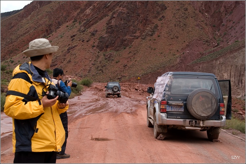 沿着怒江前进,逐渐进入怒江大峡谷,景色非常壮美,不过两侧的山体很不稳定,在公路上修建了很多水泥框架,上面装了防护网,网上面有不少从山上掉下来的石头。接近一个非常险要的隘口,一座桥跨越怒江,两侧有武警把守,还有碉堡。我比较慢地开过去,听到后面一个武警小头目在嚷嚷什么,等过了桥到了对岸,卫兵把我们拦住,说我们超速了,让我们退回去重新过桥,在这种地方不便理论,我只好挂上倒档慢慢退了回去,回到桥头,武警说这里限速5公里,牌子上写的有,可是那个牌子藏在后面,任何司机正常行驶都不可能看到,另外刚才过桥的时候,北方郎拍了几张照片,武警要求删除,他一张一张看,确认删除了以后才让我们重新过桥,我们通过对讲机告诉了后面的老曲,提醒他们不要超速、不要拍照。 继续前进,周围的山和土地都是红色的,不久遇到一处大的泥石流,前面已经堵了一些车,整个路面全部被淹没,下车看看情况,一辆桑塔纳陷在中间,正是一直跑在我们前面的一辆当地车。几个武警说那辆车油管被刮断了,有辆大车把桑塔纳拖出去,整个路面完全看不到了,到处是泥浆和乱石,不知道哪里深哪里浅,这时一辆IVECO准备往过开了,我立刻把钥匙给了北方郎,让他开,毕竟他更了解自己的车。我们马上上车,跟上IVECO,看着前面车压开的地方,找好线路,车还是侧滑了几次,并且有些刮底,毕竟是四驱车,顺利过了泥石流,正准备跟老曲讲讲怎么过呢,结果一回头,他的宝来居然已经过来了,他也是跟了一辆车,选准线路过来的。老曲开车的技术没得说,毕竟是深圳十大试车手之一。