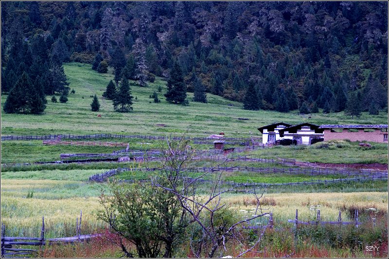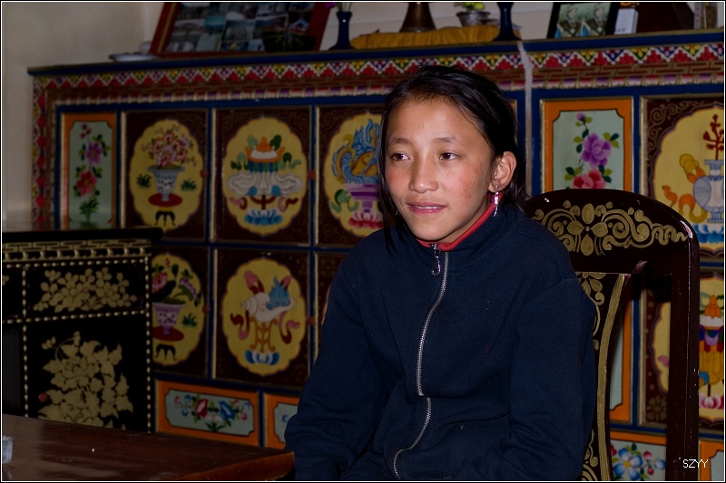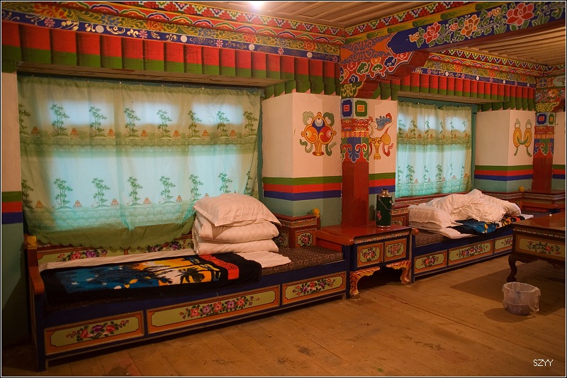 8点半,路过属于鲁朗的扎西岗民俗村,里面可以住宿,老曲和关老师联系好了住的地方,我们在次仁家吃了晚饭,在院子里遇到几个深圳来的小姑娘在聊天,她们是从成都包车进藏的。次仁以前当过村长,汉话讲的很流利,现在开家庭旅馆,女儿在拉萨酒店做前台服务,外孙女在拉萨读书,放假回来帮外公招待旅客,小姑娘很精明,跟他外公一样,饭吃的不怎么样,可是说良心话,价钱很贵,尤其是"藏香腊肉",百分之百的肥肉,我们基本上是没动筷子,但是价钱占了整个晚餐的一半。次仁家的房子很大,很漂亮。吃完饭,次仁安排我们住到尼玛次仁家。洁白的被褥,很干净,晚上睡的很好。
