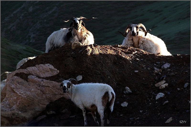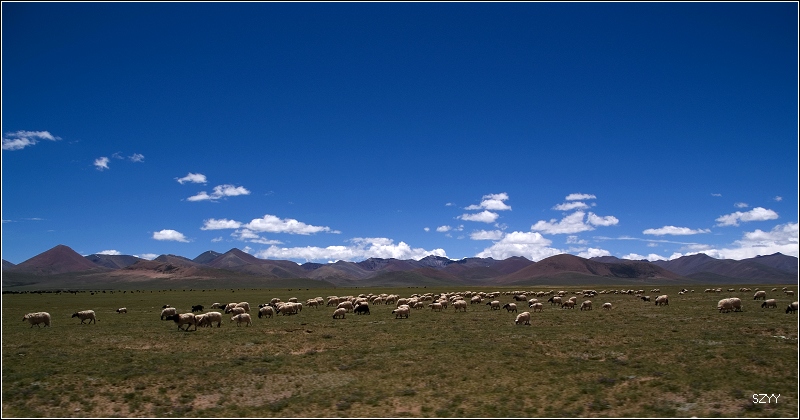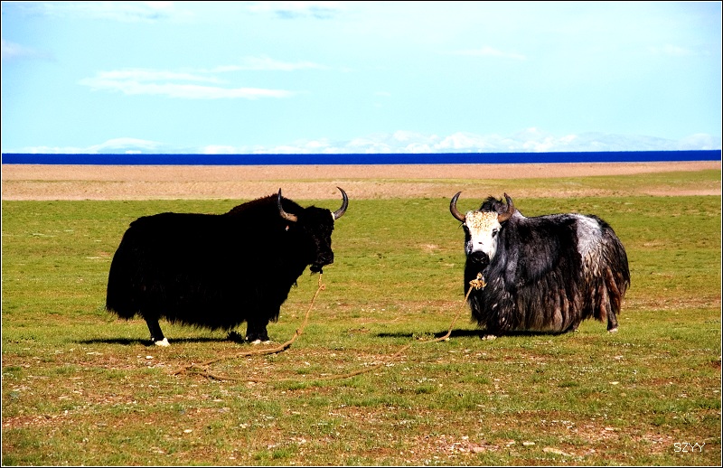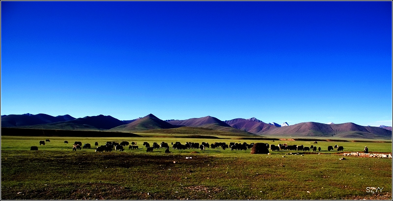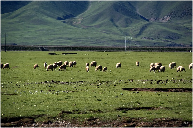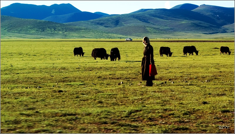 很想离开路基在草原上飞驰,可是又怕压坏了草皮,仔细看看有车辙,是牧民开车走的地方,我们也就大着胆子离开公路开到了草原上,草原上有很多散放的牦牛、马和羊,不知名的鸟离我们只有一两米都不飞。开了一段,到了牧民跟前,我们又沿着车辙重新回到公路上。