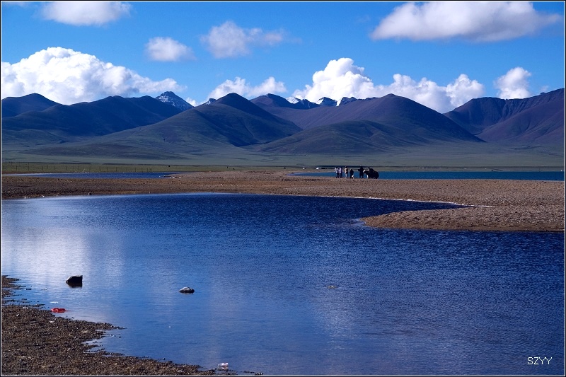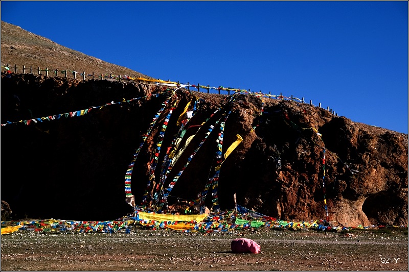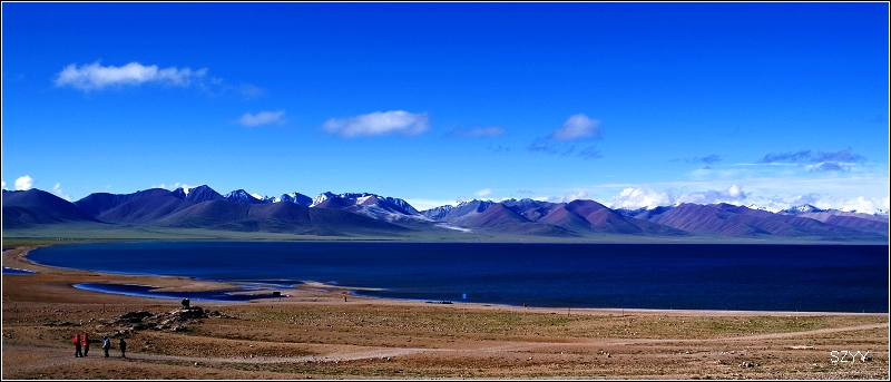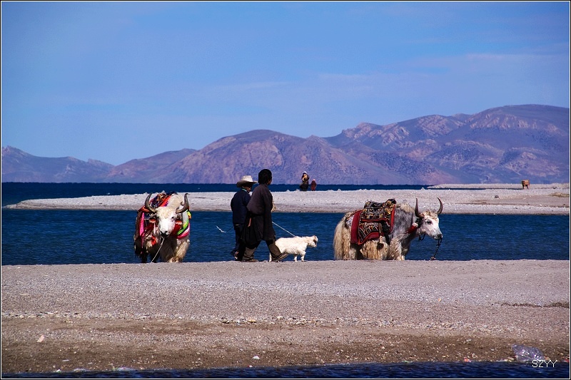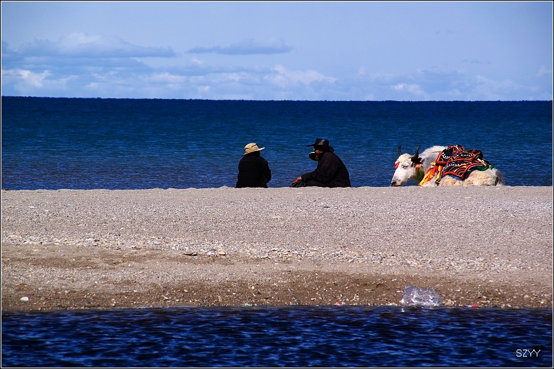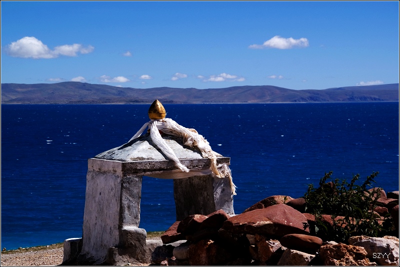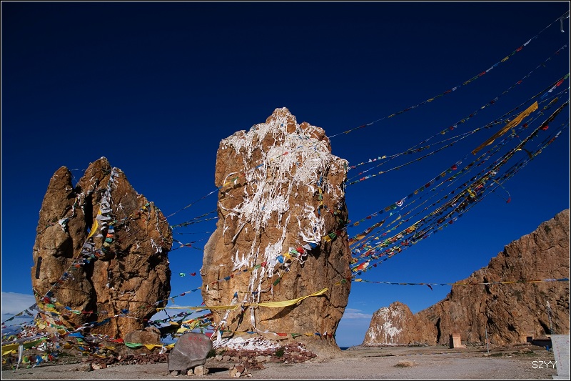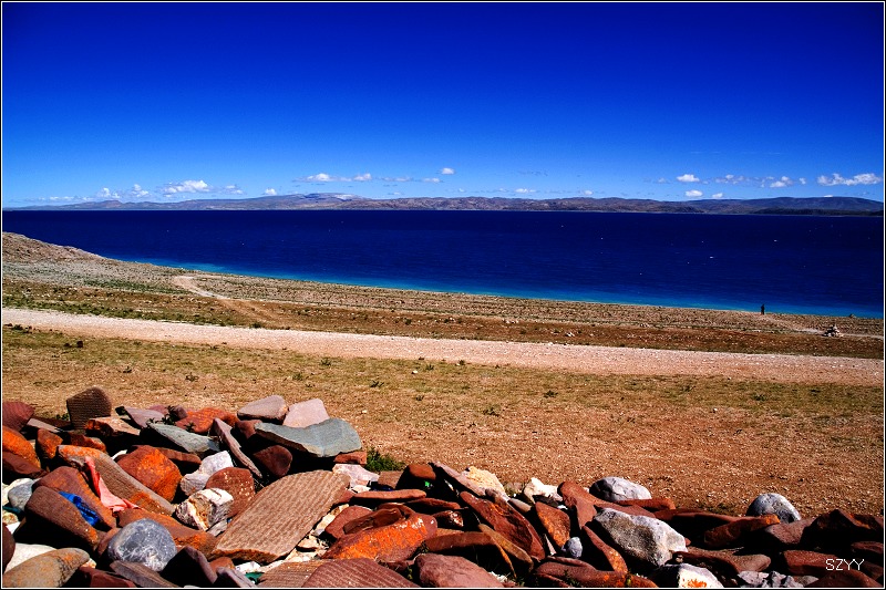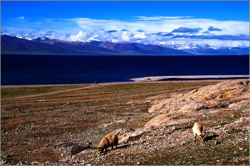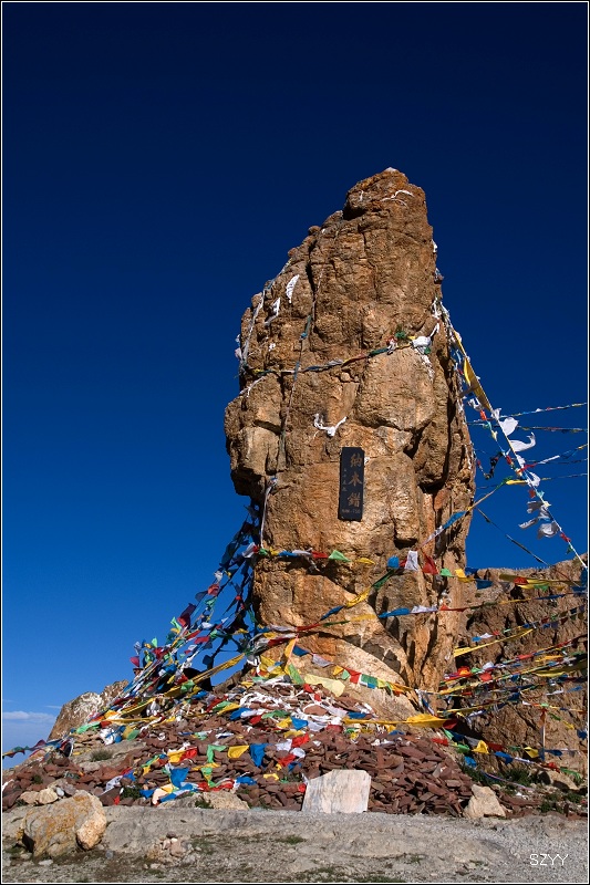 走了几十分钟,到达海拔5177米的那根拉山口,一过山口,就看见幽蓝的纳木措静静地躺在山下,很奇怪水为什么能蓝成这样。