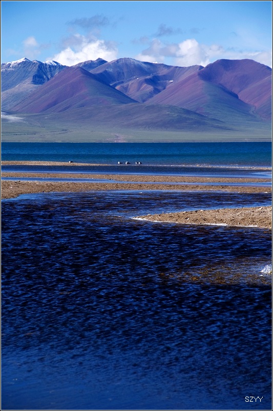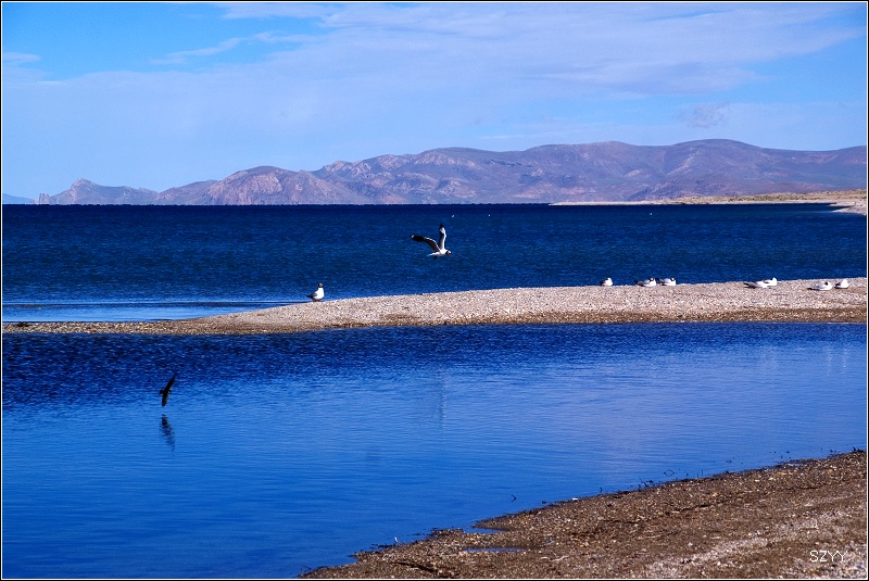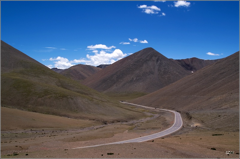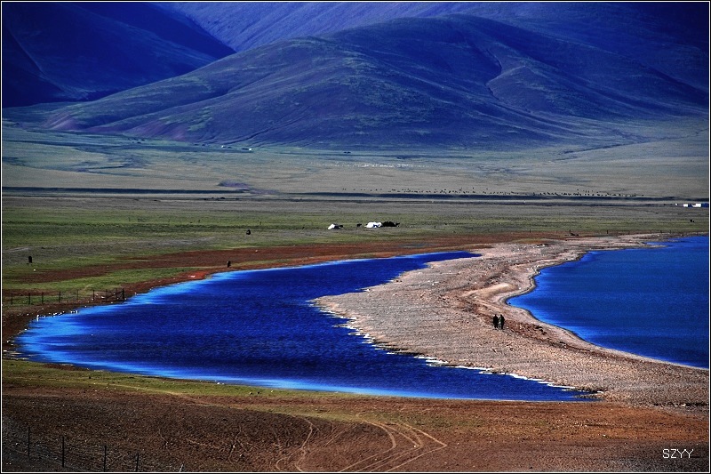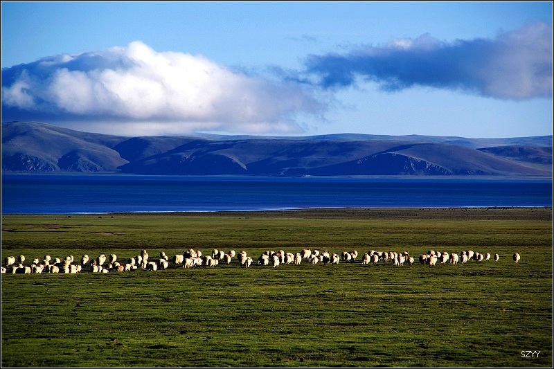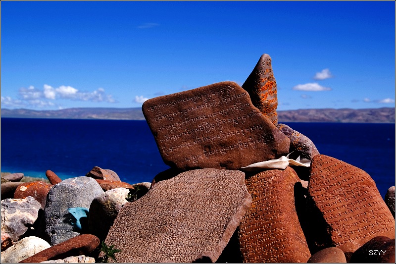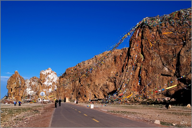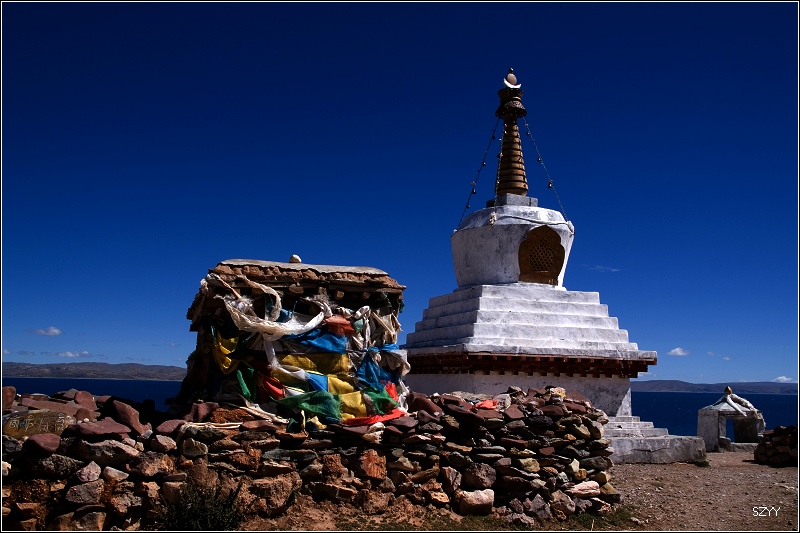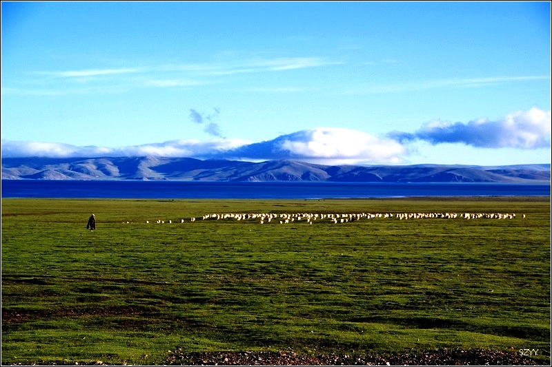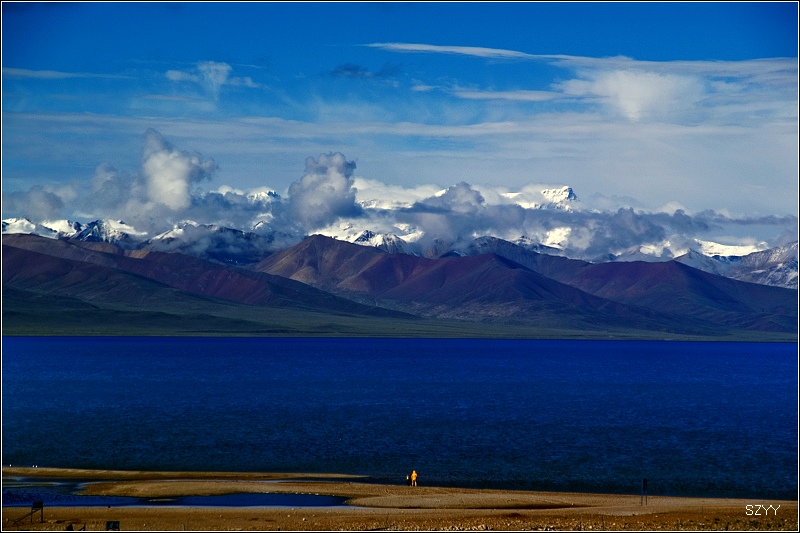 走了几十分钟,到达海拔5177米的那根拉山口,一过山口,就看见幽蓝的纳木措静静地躺在山下,很奇怪水为什么能蓝成这样。
