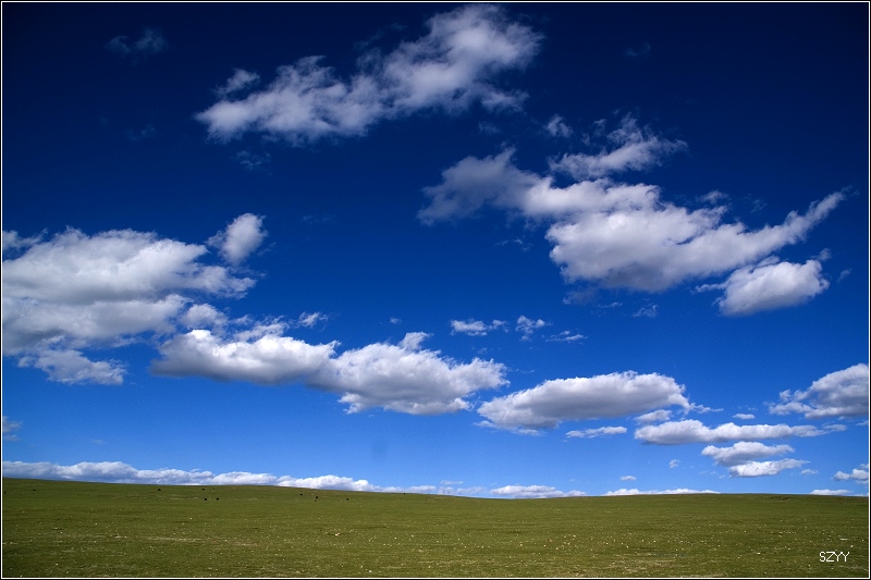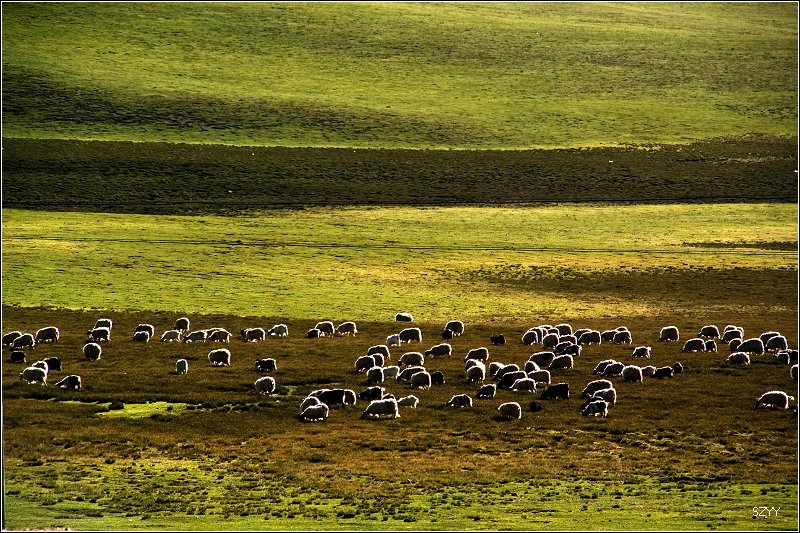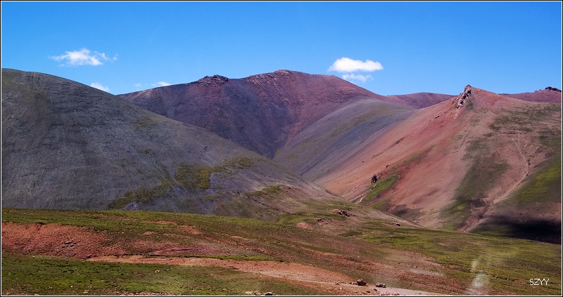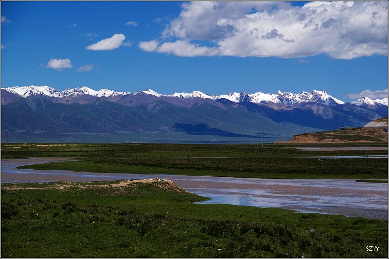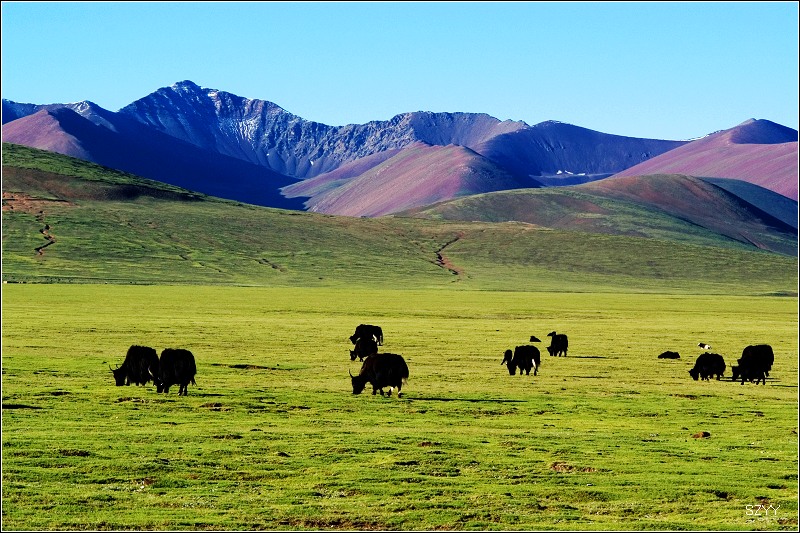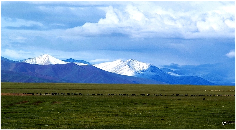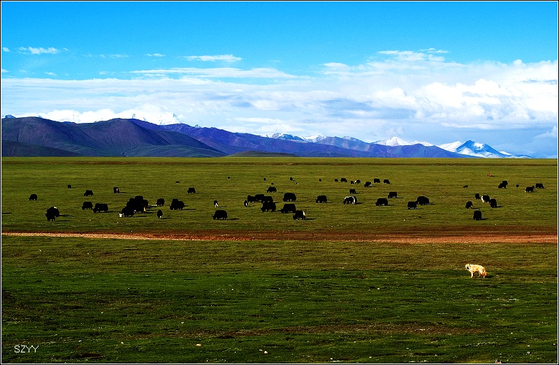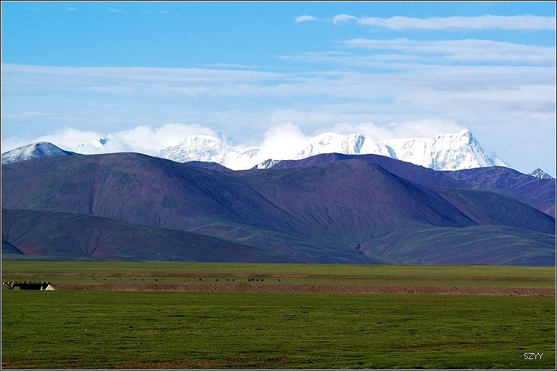 下山,眼前豁然开朗,一大片平坦的草原展现在眼前,两侧的雪山离的很远,整个草原上就只有我们一辆车,不由得让人想高速狂奔。