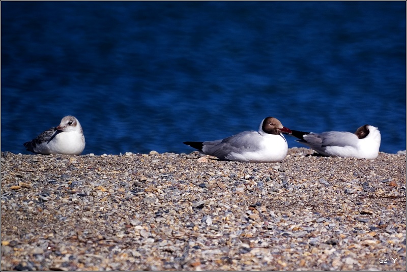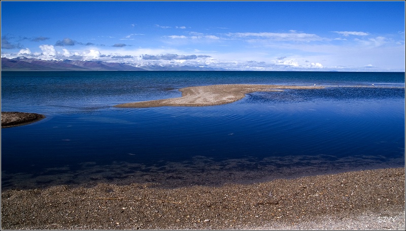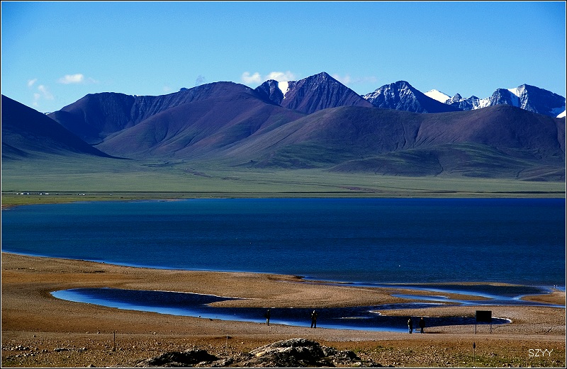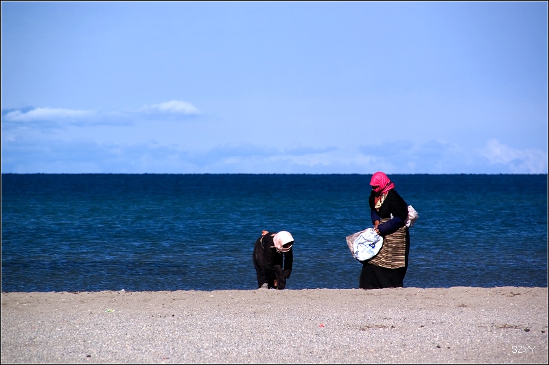 虽然海拔不是很高,但是由于植物稀少,我感觉缺氧比较明显,所以把动作放的很慢,上高原才会理解为什么那些登山运动员动作都那么慢。风很大,全身上下捂的严严实实,带着手套还觉得手冷。先在迎宾石附近拍照,然后用极其缓慢的动作,花了不少时间才走到湖边,拍了一会儿,再走回来,因为是上坡,所以动作更慢。回到停车场,人和车逐渐多了起来,遇见一辆从肇庆来的本田飞度,一家三口人,是从青藏路来的,跟我和老郎一起合了张影。他们说青藏路有一段路面很烂。去年他开车走过青藏线,今年路况比去年要差,大货车超载,对路面损坏很严重。