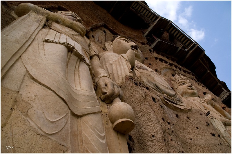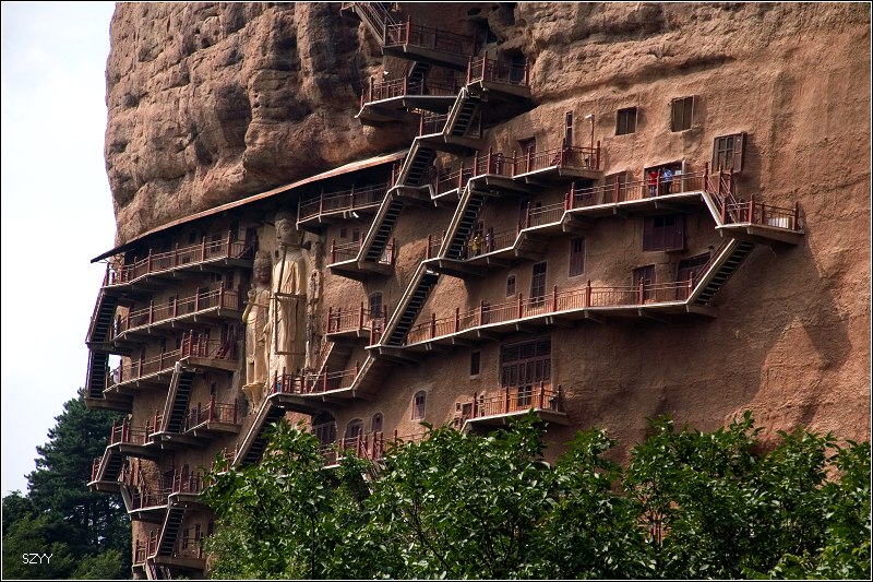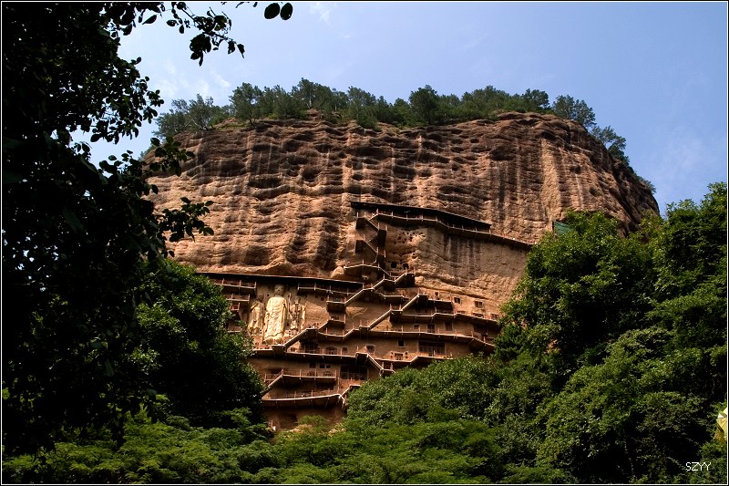 当人们进入麦积山风景区后,首先映入眼帘的是凭崖而凿的一组雕刻造像。中间一座佛,高达15米,左右两尊菩萨侍立,喜笑颜开,迎送来往游客。行至山前,抬头仰望,只见龛窟密如峰房,依窟建檐,层层相叠。栈道云梯修建于悬崖,浅龛深窟开凿于峭壁,其建筑高超雄伟,工程奇险浩大,令人赞绝。历代游客诗人,虽惊慕不已,敢于攀至顶端者却少如凤毛麟角。唯心史观有五代诗人王仁裕斗胆攀登,才写下了:“蹑尽悬崖万仞梯,等闲身与白云齐;檐前下视群山小,堂上平分落日低;绝顶路危人少到,古岩松健鹤频栖;天边为要留名姓,拂石殷勤手自题。”的切身感观。不过,现在的麦积山经过大规模的加固修整和栈道修复,摇摇欲坠的崖体已经稳定,山上栈道也宽阔整齐,安全可靠,昔日王仁裕笔下的险恶情景早已成为历史。人们可以放心大胆地登游各个崖阁,随心所欲地进入各个洞窟,感情奔放地远眺山下美景。