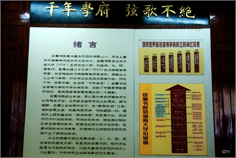 岳麓书院是中国古代四大书院之一,历史上著名的高等学府及学术文化中心。岳麓书院自北宋开宝九年(976)正式创立以来,历经宋、元、明、清各代,至清光绪二十九年(公元1903年)改为湖南高等学堂,尔后相继改为湖南高等师范学校、湖南公立工业专门学校,1926年正式定名湖南大学。历时千年,弦歌不绝,故世称“千年学府”。从岳麓书院至湖南大学的千年办学历史,反映了中国教育制度的变迁,是我国高等教育发展史的一个缩影。 岳麓书院创立伊始,即以其办学和传播学术文化而闻名于世。北宋真宗皇帝召见山长周式,颁书赐额,岳麓之名始闻于天下,有“潇湘洙泗”之誉。南宋张蛑鹘蹋理学史上颇负盛名的“湖湘学派”即发展于此;朱熹两度讲学,书院盛极一时,出现了“座不能容”、“饮马池水立涸”的盛况。其后,明代中叶的阳明学、明末的东林学、清乾嘉时期的汉学及晚清的新学,都曾在此得以传习和交流。岳麓书院的学术与教育,对湖湘文化传统的形成和发展产生了深刻的影响。