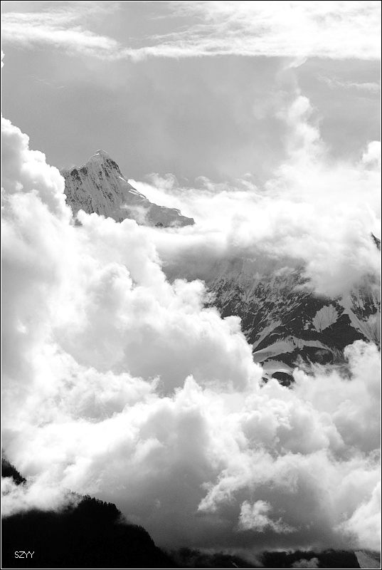 第九天(7月22日)战略大转移 本来还想看运气,早晨是否能放晴,拍到梅里日出,所以昨晚专门问好了平时日出的时间,上了闹钟,早晨醒来一看,仍然在下雨,于是按原定计划,不吃早餐,走德荣,我和北方郎叫了达咏和老严,到了楼下,客栈老板还没起床,打开客栈的门,广州光头的4500已经等在外面。 我们把行李装车,等着关老师和老板结帐,黑暗中两个当地人走过来,光头上前问了问,当地人说德钦过去一点,整个山体塌了下来,光头立刻把消息告诉我们。如果真这样,我们就连德荣也不能去了,到底该怎么办,我们决定还是先探探路,于是我来开车,因为后面还有更难走的路由北方郎和达咏开。 光头的4500和老曲的宝来跟在后面,下着雨,天黑沉沉的,云雾弥漫,能见度只有几十米,我打开大灯和雾灯和警示灯,小心翼翼地向黑暗中驶去。这时不知道其他人怎样,我心里还是有一丝恐惧的。边开车边想起一部美国电影里的情景,电影名字忘了,就是描写火山爆发的时候,一个人开车逆着逃难的人流,顶着四处飘落的火山灰和落石,找寻家人的事。因为我们这时的处境也不妙,周围的山体也随时有可能滑塌。这时后面赶上来一辆当地的微型面包车,开的比较快,很快没入黑沉沉的云雾中了,我大着胆子跟上去往前开,只要不看到前面的车被拦住或倾覆,就说明没事,豁出去了。走过几个路段,有不少山上塌下来的泥石,看着比较凶险,一边瞪大两眼,随时查看山上和路面的情况,一边迅速通过,此处不可久留。 谢天谢地,终于看到德钦县城了,这段路算闯过来了,没看到山体把路面全部掩埋,这时看到了前面那辆当地的小微型面包,停在一个小铺前,县城没几家亮灯的,停下来问了问藏族司机,他说他也去奔子栏,现在先喝喝酥油茶,让我们一会儿可以跟着他。我们谢过了他,不准备等了,因为我们今天的路很长,任务很重,所以就先走了,天逐渐亮了些,路面上有许多昨晚从山上掉下来的石头,小心谨慎,第二次驾车翻过白马雪山,前天开车第一次翻越时我看到一个山谷比较凶险,雨天很容易形成泥石流,回来时我最担心的这个山谷没出现塌方,算是运气。