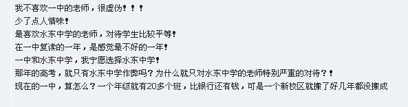 我不喜欢一中的老师,很虚伪!!! 少了点人情味! 最喜欢水东中学的老师,对待学生比较平等! 在一中复读的一年,是感觉最不好的一年! 一中和水东中学,我宁愿选择水东中学! 那年的高考,就只有水东中学作弊吗?为什么就只对水东中学的老师特别严重的对待?! 现在的一中,算怎么?一个年级就有20多个班,比银行还有钱,可是一个新校区就搬了好几年都没搬成