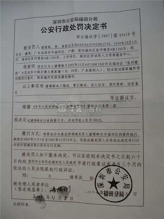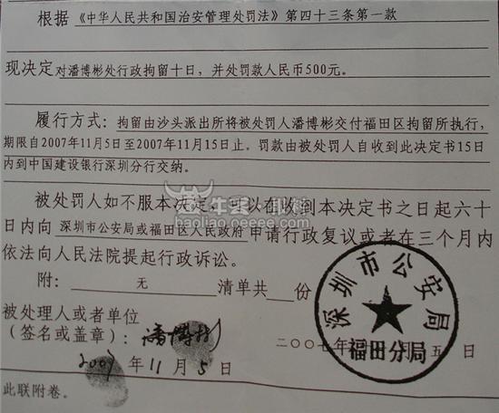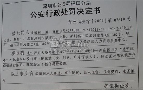 深圳市福田区劳动局职工潘博彬打人事件有了最新进展。11月5日晚上23时福田公安分局经过调查取证,对涉嫌殴打他人的潘博彬作出了治安拘留10天并罚款500元的处罚。经鉴定,被打事主陈女士为轻微伤。根据《治安管理处罚法》有关规定,福田警方作出上述处罚。
