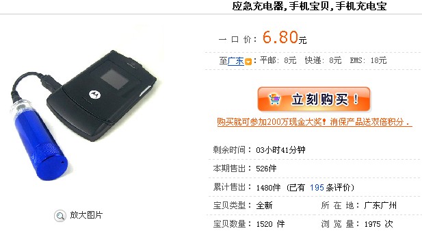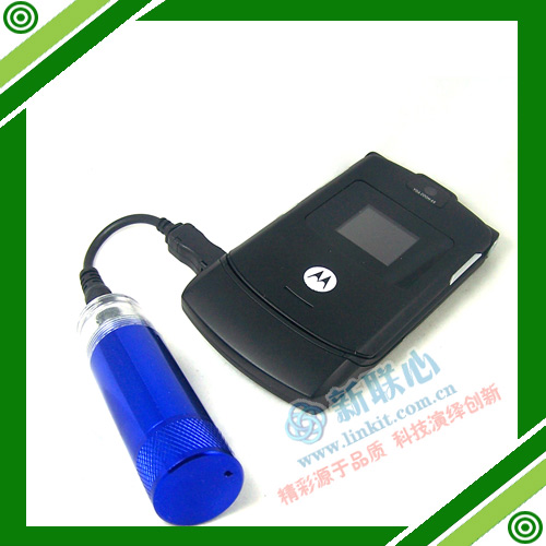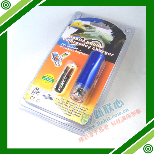 此为手机应急充电器,当您外出时,遇上手机没电时,它可帮助您在最需要时充上手机的电量。只需一粒5号电池。您可根据自己手机不同的型号来购买充电连接头。。。种类齐全,颜色不一。欢迎购买。。