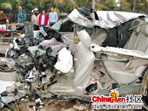 据称,当时受严重撞击后,小轿车不久即起火燃烧。当地交警等部门经奋力扑救并将大火扑灭后,立即用工具撬开小轿车车门进行抢救。由于撞击猛烈,小轿车车头及驾驶室严重损毁,男司机的头颅已被刮飞到地面上,副驾驶位的另1人(女)已血肉模糊、支离破碎;后座上则坐着4人(1男3女),其中3人也已血肉模糊,证实已死;另1人被救出时尚有微弱呼吸,但被救出后在送院途中也证实死亡。