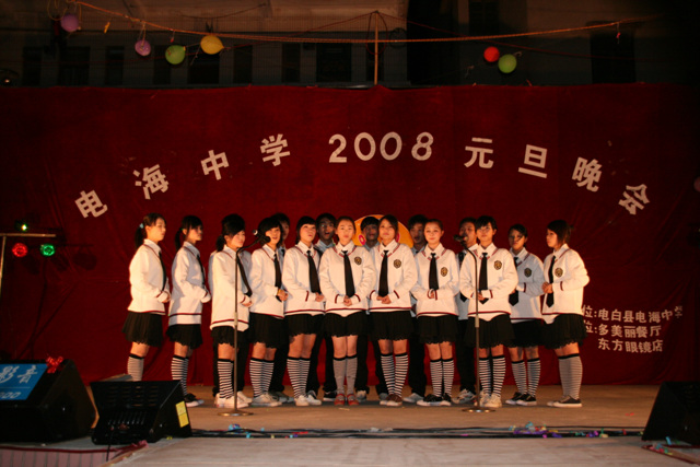 QUOTE(四中乐叔 @ 2007年12月28日 Friday, 10:05 PM) 2007-12-24 作为一名神秘嘉宾参加了电海中学2008元旦晚会,该晚会是由该校学生自编自演的晚会,节目非常精彩,值得观赏。 在当今以高考分数挂帅的紧张时刻,能由学生自编自演,彰显了电海中学学生的多才多艺。这些才艺的锻炼,也为他们在以后的高考升学中比别人多了一次机会,特别是走出社会后,也比别人多一点选择。 [snapback]2052983[/snapback]