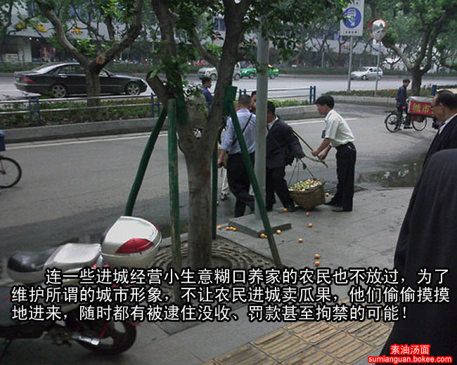 同样地,城管的目标是清除管理障碍,满足资本家环境愉悦的要求,同时剥夺了个体生存者和他们争夺消费者的任何可能,为投资的资本提供自由、舒畅的环境。从知识分子的角度,为他们提供小资产阶级情调“发骚”的环境。因此,他们是感谢城管的。