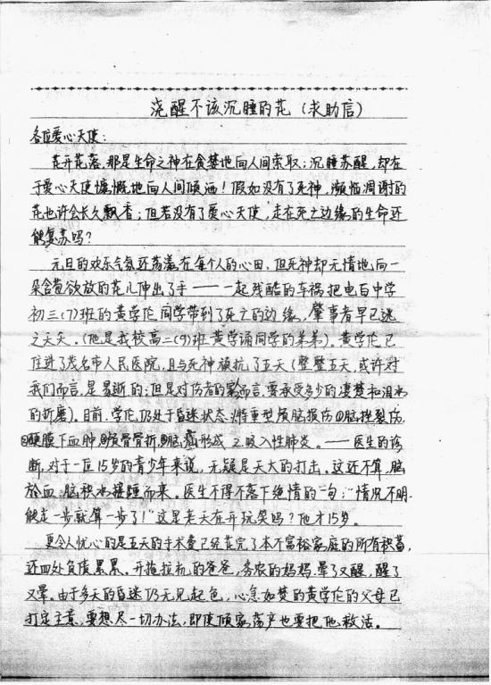 来自电白县沙琅镇尚塘管区新寨村的一户小家庭的求救, 2008.1.1,就读电白中学初三(7)班的黄学伦同学,在回家的路上,遇到车祸