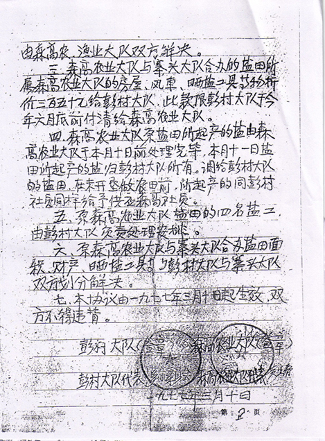 森高渔港位于水东港内西北边港湾,是电白第二大渔港,历史悠久,森高渔港由我村先祖在明朝尾清朝初开发使用至今约有400多年历史了,是我村渔民祖祖辈辈、子子孙孙一代接一代地继续使用,又是我村渔民渔船停泊避风有安全保障的一个天然良港,我村渔民渔船由解放前30多条风帆小船发展到1996年300多艘大中小机船。森高村渔民渔港远近闻名,多年来,由我村渔民出海生产提供给政府水产部门收购的渔业产品,海珍产品不计其数,对国家做出了很大的贡献,曾被评为广东省海珍品基地和海珍品产出第二大渔港的称号。森高渔港配套设施齐全,有政府设立水产收购站,有我村渔民出资出力建造的渔船修造厂,养鱼塘、养虾池、打缆场等等。历史和事实证明,森高渔港是森高村渔民的生存依靠,也是森高渔民的共同财产。而我森高村村前的港湾滩涂在有史以来也由我村村民集体管理耕作和收益。我村村前天然港湾滩涂环境洁净,是鱼、虾、蟹、贝、藻类的自然繁殖和产卵场地,滩涂中的鱼、虾、蟹、贝等海资源丰富,我村勤劳的大多数村民在滩涂内抓鱼、抓虾、抓蟹、挖贝收入可观,每年总收入可达400多万元,解决很多村民的生活问题。在解放后的大跃进时期,在陈村人民公社党委、政府的号召和带领下,我村广大农民群众与彭村、寨头三个村并肩奋斗,付出了不计多少的人力物力流汗流血,在森高至寨头滩涂地段筑堤围坝,其中建造盐田有千多亩,围坝(鱼、虾养殖池)十多个,当时坝民的收入也很不错,而盐田在二十多年来,每年晒出的盐都是给政府收购后再供应给全电白县人民食用。到1977年举国上下都是兴起农业学大寨高潮的时候,因为森高村一直都是人多地少,并又是在时任陈村人民公社党委书记潘福连等领导的牵头指导下,经过森高、彭村二农业大队广大干部社员的认真商讨后,为方便各村各地段滩涂的管理和生产,两村农业大队一致同意将所属森高农业大队的盐田与彭村大队所围垦的黄泥坝调换(见附件(1)协议书),从此,森高农业大队为了本村农业生产的出路,为了粮食,为了把滩涂变良田,就发动了一场大小老幼全民参与、声势浩大的围垦滩涂和加固原围堤的运动,并多年来,在台风季节过后,年年如此不间断地加固围堤,直到后来分田到户为止。到1996年15号强台风的大浪潮把围堤冲毁后再由私人围垦耕作至今。历史和事实也完全证明,我村前港湾一带的滩涂由我村集体管理,集体占有和收益,属我村的集体不动产,并有法律依据。
