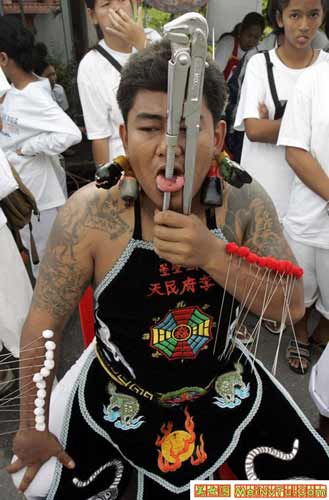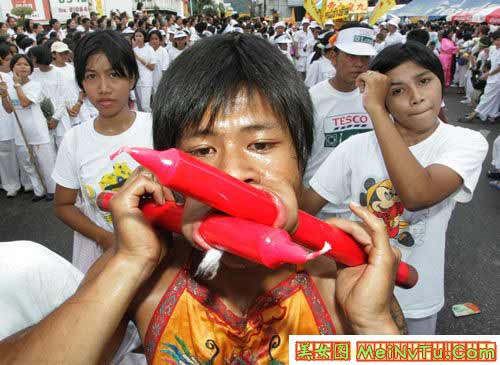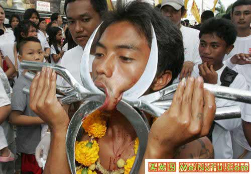 (screen.width*0.8-70)) this.width=(screen.width*0.8-70)'> (screen.width*0.8-70)) this.width=(screen.width*0.8-70)'> (screen.width*0.8-70)) this.width=(screen.width*0.8-70)'> 以上这些叫穿令箭。就是在年例游神时,把一支4-5斤重的大铁针从人体的每个部位穿过。一般情况下都是从嘴两傍穿过。有的穿三支4-5斤重的大铁针。但只能是男性,从几岁、十几、二十九、三十几、致六十岁的男人都有穿令箭的。 神奇的是,他们穿令箭时不痛,不流血,游神完了时,把令箭拨出来,用些香灰擦在穿令箭的伤口上,伤口立刻完好如初,和平常人一样了。