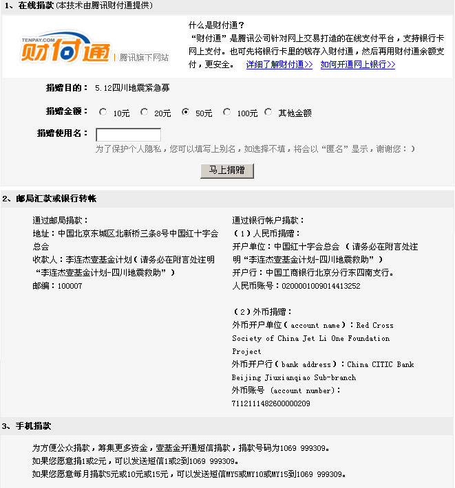 为中国红十字会捐款-----腾讯财付通联合李连杰壹基金捐款途径 (2人在浏览)