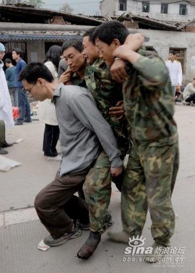 几个战士听见了就不管了,转头又要往里钻,这时坍塌就发生了,一块巨大的混凝土块眼看就在往下陷,那几个往里转的战士马上给其他的战士死死拖住,两帮人在上面拉扯,最后废墟上的战士们被人拖到了安全地带,一个刚从废墟中带出了一个孩子的战士就跪了下来大哭,对拖着他的人说你们让我再去救一个,求求你们让我再去救一个!我还能再救一个!