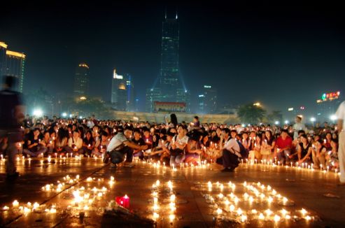 晚上我们去体育中心掉蜡烛默哀。。很多人很多蜡烛。。。有人哭。。有人喊。。
