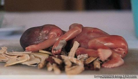 台商亦说,吃这一盅要三千五百元人民币,其他细节,他不理了。记者听他们在聊,流产或堕胎的死胎,中介人就包给产婆几百块红包,若是接近足月引产的活胎,则要付两千元红包给女婴的父母,当是收养;至于婴儿交到餐厅时,都已死亡,之前是死是活,已无从细考了