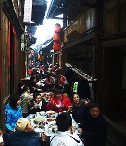 中午,传统的祭祀祈福活动结束后,在长达20分钟的鞭炮声中,年饭正式开席。260张摆满菜肴的桌子和上千游客,将1,132米长的老街挤得满满当当。