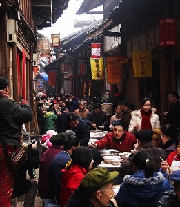 【大纪元1月25日讯】昨天,黄历腊月二十八,江津区中山古镇摆出千米长宴,800人同时下厨,2,800余人共进午餐庆新年。这是中山镇第三次在新年前夕摆下千米长宴,今年前往吃长宴年饭的游客人数是历届最多的。